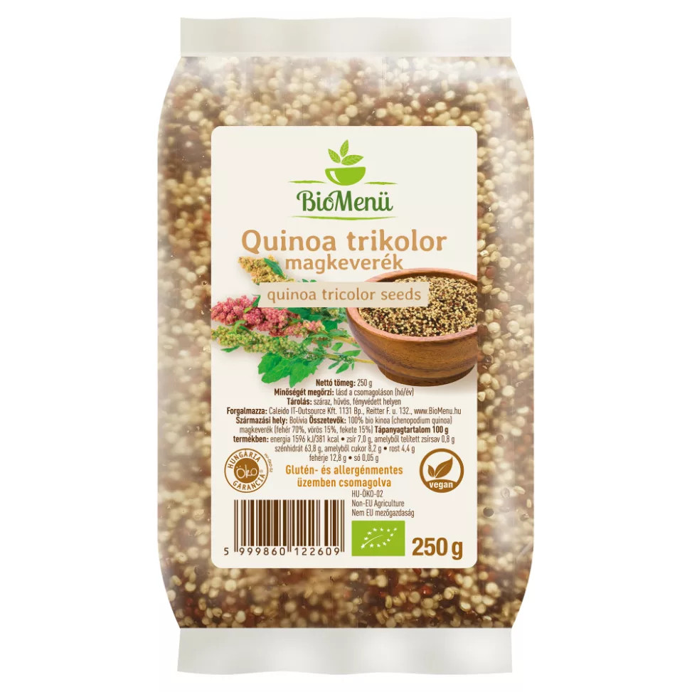 A BioMenü BIO trikolor quinoa háromféle quinoa – fehér, vörös és fekete – harmonikus keveréke. A quinoa természetesen gluténmentes, magas fehérjetartalmú álgabona, amely ritka módon mind a kilenc esszenciális aminosavat tartalmazza. A trikolor keverék nemcsak látványos, hanem tápanyagokban is kiemelkedően gazdag: magas a rost-, magnézium-, vas-, B‑vitamin-, kálium-, foszfor- és antioxidáns tartalma.